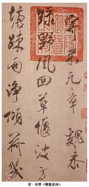 宋代以欧阳修、苏轼为代表,倡导“学书消日”的态度和“意造无法”的创作观念,注重张扬书家主体精神世界的特殊性。苏轼、黄庭坚、米芾等代表书家,无不是个性强烈、风标独树。苏轼的形式并不完美,字形有时过扁、用笔有时过肥,而黄庭坚却认为,这好比西施捧心,正是其妩媚之处。黄庭坚从柳公权、《瘗鹤铭》中悟出结构的内紧外放,形成独特的欹侧而辐射的结构,又从舟人荡桨悟出笔法的擒纵起倒,故用笔纵放如长枪大戟,但他的矛盾对比有时过于强烈、并不协调,他也并不真正避忌。米芾学古功力无人能及,但当他放笔自运时,却如“风樯阵马”、自由奔放、意足自足、不问工拙。这种书风,使书家的精神得以自在地遨游、心灵得以适意地逍遥、情感得以真实地展示,“书相”、“人心”,浑融无间。
