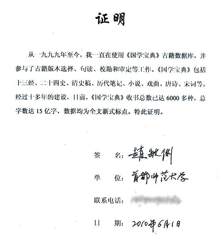 从一九九九年至今,我一直在使用《》古籍数据库,并参与了古籍版本选择、句读、校勘和审定等工作。《》包括十三经、二十四史、清史稿、历代笔记、小说、戏曲、唐诗、宋词等。经过十多年的建设,目前,《》收书总数已达6000多种,总字数达15亿字,数据均为全文新式标点。特此证明。