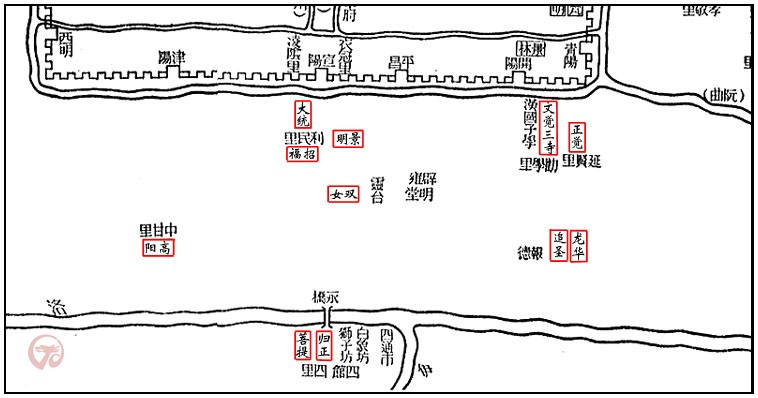 国学永桥以南,圜丘以北,伊洛之间,夹御道东有四夷馆,一曰金陵,二曰燕然,三曰扶桑,四曰崦嵫。道西有四夷里:一曰归正,二曰归德,三曰慕化,四曰慕义。吴人投国者,处金陵馆。三年已後,赐宅归正里。
