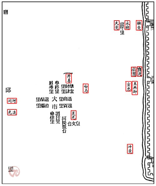 国学自退酤以西,张方沟以东,南临洛水,北达芒山,其间东西二里,南北十五里,并名为寿丘里,皇宗所居也。民间号为王子坊。