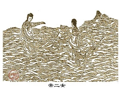 国学又东南一百十里,曰洞庭之山,其上多黄金,其下多银铁,其木多柤梨橘櫾,其草多葌、蘪芜芍药芎藭。帝之二女居之,是常游于江渊。澧沅之风,交潇湘之渊,是在九江之间,出入必以飘风暴雨。是多怪神,状如人而载蛇左右手操蛇。多怪鸟。
