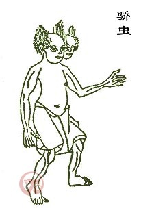 《中次六经》缟羝山之首,曰平逢之山,南望伊洛,东望谷城之山,无草木,无水,多沙石。有神焉,其状如人而二首,名曰骄虫,是为螫虫,实惟蜂蜜之庐,其祠之:用一雄鸡,禳而勿杀。