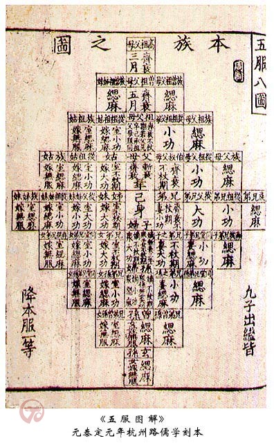 国学緦麻,三月者。族曾祖父母,族祖父母,族父母,族昆弟;庶孙之妇,庶孙之中殇;从祖姑、姊妹适人者,报;从祖父、从祖昆弟之长殇;外孙,从父昆弟侄之下殇,夫之叔父之中殇、下殇;从母之长殇,报;庶子为父后者,为其母;士为庶母;贵臣、贵妾;乳母,从祖昆弟之子,曾孙,父之姑,从母昆弟,甥,婿,妻之父母,姑之子,舅,舅之子;夫之姑姊妹之长殇;夫之诸祖父母,报;君母之昆弟;从父昆弟之子长殇,昆弟之孙之长殇,为夫之从父昆弟之妻。