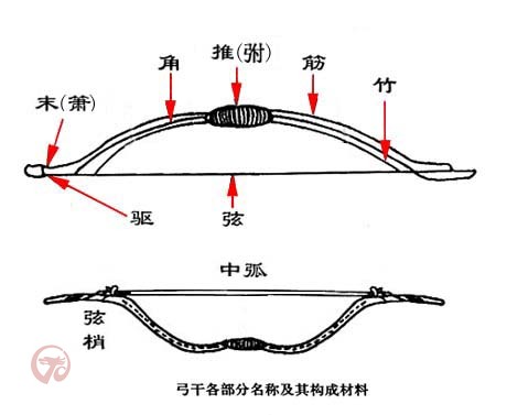 弓人为弓,取六材必以其时,六材既聚,巧者和之。干也者,以为远也;角也者,以为疾也;筋也者,以为深也;胶也者,以为和也;丝也者,以为固也;漆也者,以为受霜露也。凡取干之道七:柘为上,檍次之,檿桑次之,橘次之,木瓜次之,荆次之,竹为下。凡相干,欲赤黑而阳声,赤黑则乡心,阳声则远根。凡析干,射远者用埶,射深者用直。居干之道,菑栗不迆,则弓不发。凡相角,秋閷者厚,春閷薄,稚牛之角直而泽,老牛之角紾而昔。疢疾险中,瘠牛之角无泽。角欲青白而丰末,夫角之末,蹙于而休于气,是故柔。柔故欲其埶也;白也者,埶之征也。夫角之中,恒当弓之畏,畏也者必桡。桡,故欲其坚也;青也者,坚之征也。夫角之末;远于而不休于气,是故脃。脃故欲其柔也;丰末也者,柔之征也。角长二尺有五寸,三色不失理,谓之牛戴牛。凡相胶,欲朱色而昔,昔也者,深瑕而泽,紾而抟廉。鹿胶青白,马胶赤白,牛胶火赤,鼠胶黑,鱼胶饵,犀胶黄。v凡昵之类不能方。凡相筋,欲小简而长,大结而泽,小简而长。大结而泽,则其为兽必剽,以为弓,则岂异于其兽,筋欲敝之敝,漆欲测,丝欲沈,得此六材之全,然后可以为良。凡为弓,冬析干而春液角,夏治筋,秋合三材,寒奠体,冰析灂。冬析干则易,春液角则合,夏治筋则不烦,秋合三材则合,寒奠体则张不流,冰析灂则审环,春被弦则一年之事。析干必伦,析角无邪,斫目必荼。斫目不荼,则及其大修也,筋代之受病。夫目也者必强,强者在内而摩其筋,夫筋之所由幨,恒由此作,故角三液而干再液。厚其帤,则木坚;薄其帤,则需,是故厚其液而节其帤,约之。不皆约,疏数必侔,斫挚必中,胶之必均。斫挚不中,胶之不均,则及其大修也,角代之受病,夫怀胶于内而摩其角,夫角之所由挫,恒由此作。凡居角,长者以次需,恒角而短,是谓逆桡,引之则纵,释之则不校。恒角而达,譬如终绁,非弓之利也。今夫茭解中有变焉,故挍;于挺臂中有柎焉,故剽。恒角而达,引如终绁,非弓之利也。挢干欲孰于火而无赢,挢角欲孰于火而无燂,引筋欲尽绝无伤其力,鬻胶欲孰而水火相得,然则居旱亦不动,居湿亦不动。苟有贱工,必因角干之湿以为之柔,善者在外,动者在内。虽善于外,必动于内,虽善亦弗可以为良矣。凡为弓,方其峻,而高其柎,长其畏,而薄其敝,宛之无已。应下柎之弓,末应将兴。为柎而发,必动于閷,弓而羽閷,末应将发。弓有六材焉,维干强之。张如流水。维体防之,引之中参。维角之,欲宛而无负弦,引之如环,释之无失体。如环,材美,工巧,为之时,谓之参均。角不胜干,干不胜筋,谓之参均。量其力,有三均,均者三,谓之九和。九和之弓,角与干权,筋三侔,胶三锊,丝三邸,漆三斞。上工以有余,下工以不足。为天子之弓,合九而成规。为诸侯之弓,合七而成规。大夫之弓,合五而成规。士之弓,合三而成规。弓长六尺有六寸,谓之上制,上士服之;弓长六尺有三寸,谓之中制,中士服之;弓长六尺,谓之下制,下士服之。凡为弓,各因其君之躬,志虑血气,丰肉而短,宽缓以荼。若是者为之危弓,危弓为之安矢,骨直以立,忿埶以奔。若是者为之安弓,安弓为之危矢,其人安,其弓安,其矢安,则莫能以速中,且不深。其人危,其弓危,其矢危,则莫能以愿中。往体多,来体寡,谓之夹臾之属,利射侯与弋。往体寡,来体多,谓之王弓之属,利射革与质。往体来体若一,谓之唐弓之属,利射深。大和无灂,其次筋角皆有灂而深,其次有灂而疏,其次角无灂。合灂若背手文。角环灂,牛筋贲灂,麋筋斥蠖灂。和弓毄摩,覆之而角至,谓之句弓。覆之而干至,谓之侯弓。覆之而筋至,谓之深弓。