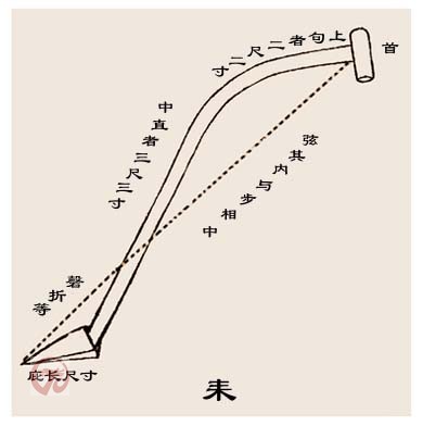 车人为耒,庛尺有一寸,中直者三尺有三寸,上句者二尺有二寸。自其庛,缘其外,以至于首,以弦其内六尺有六寸,与步相中也。坚地欲直庛,柔地欲句庛,直庛则利推,句庛,则利发。倨句磬折,谓之中地。