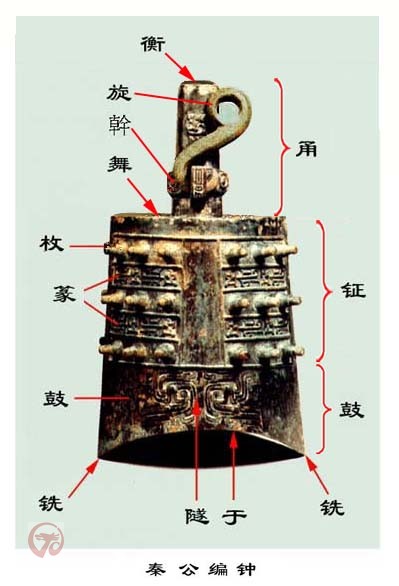 凫氏为钟,两栾谓之铣,铣间谓之于,于上谓之鼓,鼓上谓之钲,钲上谓之舞,舞上谓之甬,甬上谓之衡,钟县谓之旋,旋虫谓之干,钟带谓之篆,篆间谓之枚,枚谓之景,于上之攠谓之隧。十分其铣,去二以为钲。以其钲为之铣间,去二分以为之鼓间。以其鼓间为之舞修,去二分以为舞广。以其钲之长为之甬长,以其甬长为之围。参分其围,去一以为衡围。参分其甬长,二在上,一在下,以设其旋。薄厚之所震动,清浊之所由出,侈弇之所由兴,有说。钟已厚则石,已薄则播,侈则柞,弇则郁,长甬则震。是故大钟十分其鼓间,以其一为之厚;小钟十分其钲间,以其一为之厚。钟大而短,则其声疾而短闻;钟小而长,则其声舒而远闻。为遂,六分其厚,以其一为之深,而圜之。