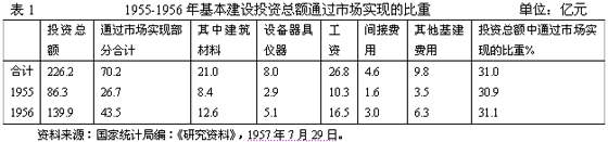 1956年前后,陈云提出“三个主体、三个补充”,李富春提出指令性计划与指导性计划相结合。周恩来、陈云领导纠正急躁冒进倾向,压缩基本建设投资,调整局部比例失调,促使1957年经济建设取得较好效益,超额完成了“一五”计划。期间基本建设投资与市场供求有着密切联系,基本建设投资总额通过市场实现的比重大约在1/3左右。详见表1: