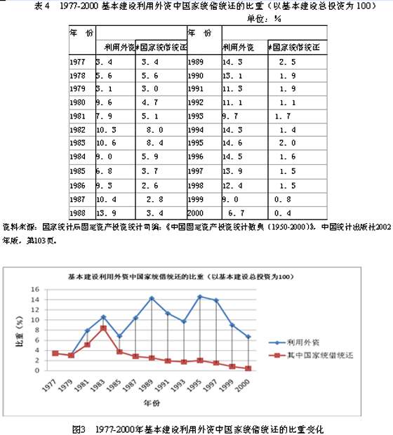 在计划经济时期,或者说1977年以前,外国资金在华投资,是通过贸易或财政途径由国家统借统还,在政府确立的项目中由政府直接投资。这部分资金列入政府预算之中。因此,在国家统计局编制的统计资料中,不体现为“利用外资”。改革开放以来,由于外资在华投资中国家统借统还的比重呈明显下降趋势,从1977年开始,国家统计局关于固定资产投资资金来源的统计中,将国家统借统还部分包含在“利用外资”之中。详见表4。该表反映,1977年利用外资尚全部由国家统借统还,此后随着利用外资在基本建设投资中的比重增长,国家统借统还的比重却不断下降,而且这种下降自1996年以来,并不随着外资投资比重的起伏变化,而呈持续下降的状态。至2000年仅占全部投资的0.4%。这反映了政府对外国在华投资的影响已主要不体现在政府直接投资之中。外资在华基本建设投资主要是受市场直接作用的。详见表4、图3。