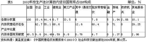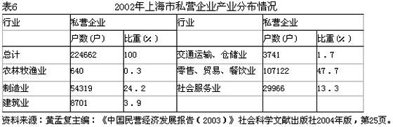 表6反映了2002年上海市私营企业在不同产业分布的状况。其中零售、贸易、餐饮业最高,为47.7%;其次为制造业,占24.2%,社会服务业占13.3%。私营经济受着市场直接作用。分布所占比重不同,同样反映了市场与政府对于不同行业或产业中投资作用的差异。