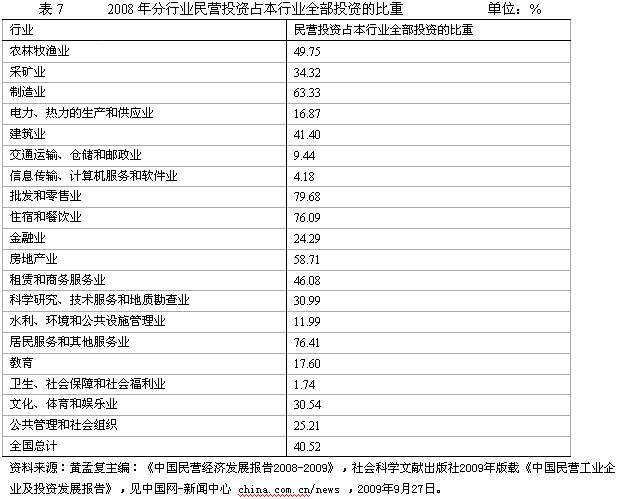 这从内资民营企业在不同行业中的比重可以看出。表5、6、7和图4反映,2002年和2008年,内资非国有企业产值在农业、房地产业、批发零售业、建筑业、工业中的产值均占到50%左右甚至50%以上,市场在这些行业的影响是巨大的。而在通信交通业、金融业、政府机关和其他服务业等领域非国有企业比重很低,甚至没有,市场的影响则相对较小。2003年以来,随着股份制银行与中小银行的发展,非国有金融业比重为零的状况有变化,2008年内资民营金融业在本行业中的比重已上升至24.29%。但是这一领域非国有企业比重仍很低,市场的作用的比重仍然较小。详见表7。