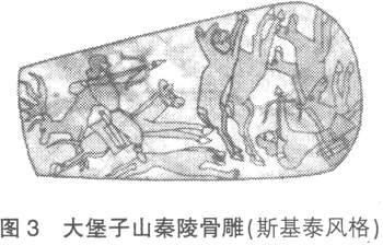 秦人与斯基泰人的这种亲密的关系.也不乏地下出土文物的验证。在甘肃大堡子山秦陵出土物中,有一两面线雕的骨片。骨片呈鞋舌状,上面线刻有骑猎图。人物披发、深目、高鼻、络腮胡子,身着紧身束带长衣,脚蹬靴子,拉弓射箭,追猎一群虎、鹿动物,充满动感,颇似以野兽纹著称的斯基泰艺术。而另一件骨雕作品传出于天水地区。其上也刻有射猎图。人物戴尖顶帽,状类武士。以动感强烈的线刻手法,突显了斯基泰艺术的风格。
