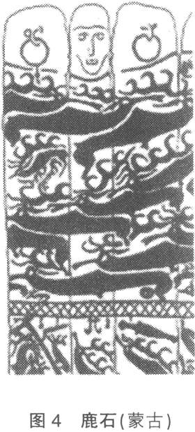 鹿石是一种散布在欧亚草原上.由人工凿刻的饰有鹿形图案的石碑。它最早被发现约在19世纪末。而真正引起学者们注意则大致始于20世纪五六十年代0根据其艺术表现的内容和风格,鹿石可划分为“典型鹿石”和“非典型鹿石”两大类。典型鹿石最为突出的特征是整个碑的造型多为拟武士人形,而鹿的形象则呈图案化和程式化。蔓草式的鹿角、鸟头鹿身的表现形式,几乎是固定不变、千篇一律的艺术手法。显然,这是由鸟和鹿两种动物合为一体,幻化而成的一种神兽(见图4)。