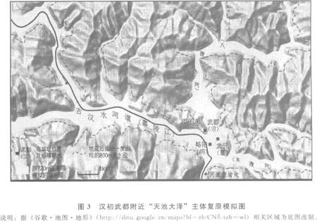 然而,汉武都城为什么要修建在武兴山上?这是因为在汉初时,今略阳县城一带的“平地”还为天池大泽的湖水所覆盖。今略阳县城一带三水(嘉陵江及其支流八渡河、东渡河)交汇,、群山环抱,属于嘉陵江上游一处不很宽阔的谷地,谷底海拔约650米左右,而谷地之南的嘉陵江出水口,因两岸为海拔l200米以上的高大山体,十分陡峭、狭窄。因此,一些学者认为,略阳一带属于山体滑坡灾害高发区。【35】如果谷地出水口的两岸山体发生较大崩塌或滑坡,完全可能把嘉陵江塞断,而使上游江段水流壅堵,形成堰塞湖。显然,所谓天池大泽,当就是先汉时代在嘉陵江上游地区形成的一处大型堰塞湖。(参见图3)今略阳一带河谷地区之所以一直没有发现汉以前的古遗址,【36】原因当在此。当然,也正是由于先汉时代有这样一处堰塞湖存在,才造成古汉水上游河道(嘉陵江上游)的较高水位,使得蜿蜒于崇山峻岭间的古汉水上游河道可以有舟楫之利,成为沟通秦蜀之间的最重要道路。如前所述,《禹贡》时代的西南少数民族因此才能够通过这条“逾于沔,人于渭”的捷径来到中原,战国时秦将司马错因此才能够从古汉水源头的“陇西”出发,顺流而下进攻千里之外的楚“黔中”。