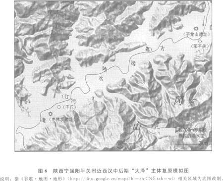 由枣林坝古代居落遗址的位置靠近嘉陵江(古潜水)的情况可推知,在汉初,人们尚可居住于阳平关谷地的台地,而前161年汉水的大量南溢,使得该遗址被洪水淹没,导致汉唐之间的文化层缺失;一直到唐中期“大泽”泽水完全消退后(参见后文),人们又来到台地遗址一带居住,于是,才造成该遗址汉代文化层上直接出现唐宋时期的瓷片。正因为阳平关谷地西汉时代大部分时间为水覆盖,人们不能像汉初和今天一样下到谷底居住,作为“大泽”中位置绝佳的孤岛子龙山,自然也就成为当时人们选择居地的所在。(参见图6)可见,阳平关谷地附近的汉代遗址,完全能够佐证历史文献所反映的情况。