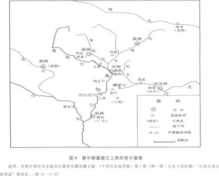 此外,由于唐绵谷县境内的古潜水成为嘉陵江的一段,于是,像汉以后命名新的“嶓冢山”一样,唐人也把县境发源于龙门山的一条嘉陵江小支流视为古潜水。【91】可见,名义上的嘉陵江水系到唐中期正式形成。(参见图8)