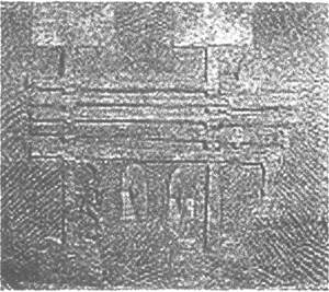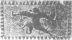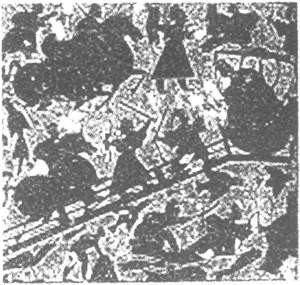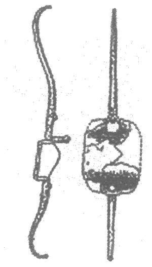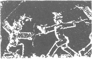 在江苏铜山十里铺出土的一块画像石,其中部清晰地刻有一钩镶和环首刀,钩镶中间镶部前面突出的长形尖锥和下钩的尖端均未见圆球状,而作锐尖形(见图3),其他图4、5、6、7、8、9等画像石、砖资料。所见战斗人员使用的钩镶,其镶前面突出的长形尖锥和下钩的尖端亦未见圆球状,均作锐尖形。