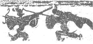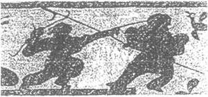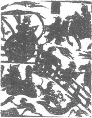 根据画像石资料看,钩镶在汉代战场上使用颇为广泛,而且灵活方便。既可以用于步兵单兵对决(见图4、5、6),也可以与骑兵搏杀(见图7):既可以在水面舟上与对手交战(见图7、8),也可以与敌方战车上的人员拼斗(见图8、9)。