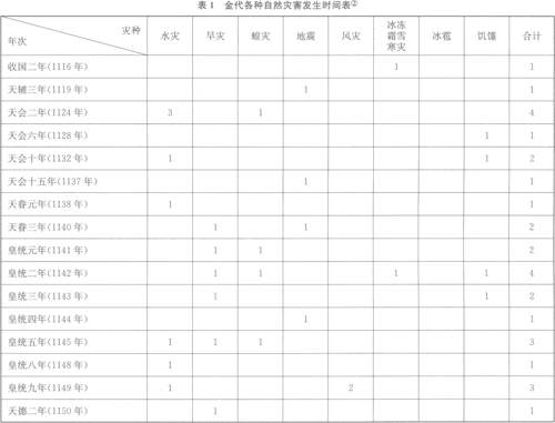 金代的自然灾害主要有水、旱、蝗虫、地震、风、雹、冰冻霜雪寒、饥馑等,其中既包括了气象灾害,也包括了地质灾害、生物灾害和水文灾害等。表l是根据有关金代的相关文献与石刻资料的记载整理出来的关于金代各类自然灾害发生的时间表。