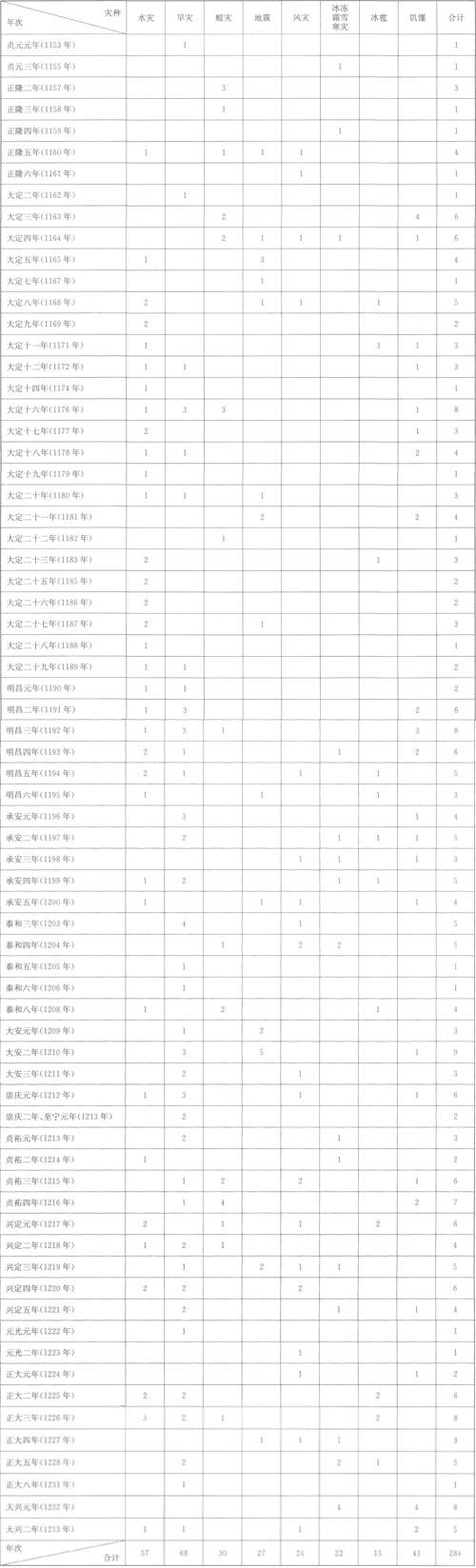 【2】本文表格中的数据主要来源于以下几种文献:《金史》卷一至卷一八皇帝之“本纪”、卷二三《五行志》、卷二七《河渠志》、卷四七至卷五○《食货志》以及《金史·列传》中的相关史料(中华书局1975年版);宇文懋昭《大金国志》卷一至卷二六皇帝“纪年”中的相关史料(中华书局1986年版);阎风梧主编《全辽金文》中的墓志铭及相关的石刻资料(山西古籍出版社2002年版);《道藏》道教人物传记中有关自然灾害的史料(文物出版社、上海书店、天津古籍出版社1988年版);张金吾《金文最》铭、行状中与金代自然灾害相关的史料(中华书局l990年版)。