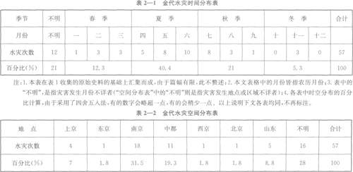 从表2—2可以看出,金朝水灾的发生与地理环境有着密切的关系。金朝水灾的多发地区为南京地区和中都地区。南京地区由于黄河流经此地,在金朝的近百年间,或决或塞,迁徙无定。史书记载,南京地区发生水灾l8次,占水灾总数的31.5%,是水灾的重灾区。其次为中都地区,共发生水灾11次,占水灾总数的19。3%。中都周围有潞水河、高梁河、卢沟河、温榆河等河流,每到汛期,暴雨连绵,由于河水疏通不当,导致水位猛涨,泛滥成灾。再其次为山东东、西路,是黄河流经之地,发生水灾5次,占水灾总数的8.8%。上京地区,有记载的水灾为4次,占水灾总数的7%。金朝的北部地区上京等地,有松花江、黑龙江、嫩江等河流,在汛期也极易泛滥成灾.地点记载不明的水灾为16次,占水灾总数的28%。金朝的东京地区、北京地区、西京地区各发生1次水灾,各占水灾总数的1.8%。