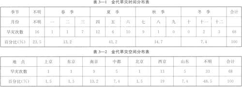 金代旱灾愈来愈频繁,其间隔时间愈来愈短。在金自立国至灭亡的120年的时间里,平均约1.8年发生1次旱灾。自金初至金世宗时期的74年间,共发生旱灾15次,平均每5年发生1次。自金章宗至金末的45年间,共发生旱灾53次,平均0.85年发生1次,几乎是年年不断。其中金大定二十九年至明昌五年(1189一l194年)连续发生旱灾。