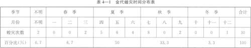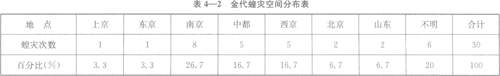 从表4—l可以看出,金代共发生蝗灾3。次。就时间分布而言,夏、秋两季较为集中,发生的次数占蝗灾总数的83.3%,其中夏季发生蝗灾的次数为15次,占蝗灾总数的5。%;秋季发生的次数为10次,占蝗灾总数的33.3%。而春季与冬季较少发生蝗灾。时间记载不明的蝗灾为2次。在金初至金世宗时期的74年中,发生蝗灾17次;在金章宗至金末的45年中,发生蝗灾13次。前一阶段平均约4.3年发生1次,后一阶段平均3.5年发生1次,后一阶段蝗灾发生的频率显然高于第一阶段。