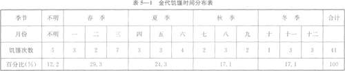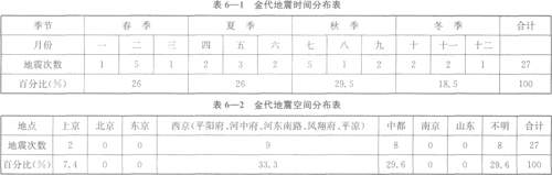 地震是地球地壳表面的岩石层受到外力和内力的共同作用,使地壳的形状发生变化——产生断裂、位移甚至引起地陷、地表波动、火山喷发的现象。从表6—1中可以看出,地震在一年四季均有发生,春季发生地震7次,夏季7次,秋季8次,冬季5次。以月份来划分的话,二月和七月发生地震的次数最多,各有5次。从地震发生的时间看,在金初至金世宗时期的74年中,共发生地震15次,平均4.9年发生1次。在金章宗至金末的45年中,发生地震的次数为12次,平均3.7年发生1次。