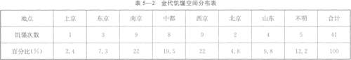 从表5—2金代饥馑的空间分布来看,以西京和南京地区发生饥馑的次数最多,各9次,分别占饥馑总数的22%。中都地区次之,共发生饥馑8次,占饥馑总数的19.5%。上京地区、北京地区和东京地区饥馑发生的次数较少,分别为1次、2次和3次。地点不明的饥馑为5次,占饥馑总数的12.2%。金代饥馑在空间分布上表现为南重北轻、由南向北逐渐减轻的特点。仅南京地区、中都地区和西京地区的饥馑就占总数的63.5%。东北部的上京、东京地区较轻,其饥馑发生的次数仅占总数的9.7%。前期饥馑的发生地为上京、北京、东京等地区,后期主要发生在南京、山东、中都、西京等地区。金代饥馑在空间分布上的这一特征反映了天灾、人祸与金代饥馑的紧密关联。