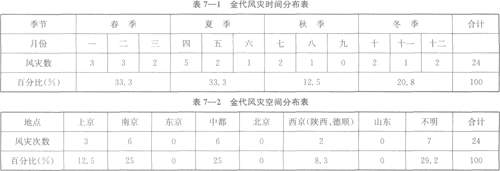 春季、夏季为风灾的多发季节,据统计,金代在这两个季节发生的风灾各有8次,分别占风灾总数的33.3%。其次是冬季,有5次,占风灾总数的20.8%。秋季较少,仅3次,占风灾总数的12.5%。在金代,越到后期,风灾发生得越频繁。金初至金世宗时期的74年中,风灾共有6次,平均l2年发生1次(可能实际情况并非如此,史书存在漏记现象)。金章宗至金末的45年中,风灾的总次数为18次,平均2.5年发生工次。