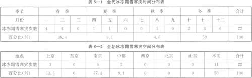 由于冰冻、霜、雪、寒各单种灾害的次数都不多,而它们在性质上又比较接近,故将其放置一类,综合考察。金朝此类灾害共发生22次,占金朝灾害总数的7.8%。在金朝,冰冻霜雪寒灾多发生在冬季与春季,其中,冬季发生儿次,占此类灾害总数的5。%;春季发生8次,占此类灾害总数的36.4%。夏、秋季相对少一些。据统计,夏季发生冰冻霜雪寒灾2次,占此类灾害总数的9.1%;秋季1次,占此类灾害总数的4.6%。此外,冰冻霜雪寒灾也呈现出前少后多的状况.在第一阶段的金初至金世宗时期的74年中,见于记载的冰冻霜雪寒灾为5次,平均14.8年发生工次。金章宗至金末的45年中,见于记载的有17次,平均2.6年发生1次。表明后期冰冻霜雪寒灾间隔的时间越来越短。这与当时的金朝正处于地球上的寒冷时期紧密相关。