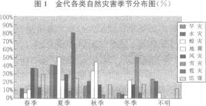 其一,灾害具有鲜明的季节性。前已有述,水灾集中发生在夏季的四至六月,这期间共发生水灾23次,占水灾总数的40.4%。旱灾也多发生在夏季,共有28次,占旱灾总数的41.2%。蝗灾以夏、秋两季居多,其中夏季发生蝗灾l5次,占蝗灾总数的50%;秋季蝗灾发生的次数为 l。次,占蝗灾总数的33.3%。春季和夏季为风灾的多发季节,这两个季节共发生风灾16次,约占风灾总数的66.6%。雹灾多发生在夏季,统计出的结果为12次,占雹灾总数的80%。饥馑多发生在春季,夏季次之。其中春季发生饥馑12次,占饥馑总数的29.3%,夏季发生饥馑10次,占饥馑总数的24.3%.以上情况都说明水、旱、蝗、风、饥馑等灾害具有鲜明的季节性。而这种数灾并至的最终结果,使金代的夏季成为灾害最多的季节,图1很直观地反映了这一特征。