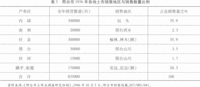 冀南皮毛产业的兴盛,得益于土布提供了源源不断的交换等价物,满足了毛皮业的原料供应。与此同时,作为西北毛皮的交换媒介,冀南土布也经由“土布换皮”贸易开拓了新的市场,使冀南农村的土布生产得以维持不坠。此后冀南土布与西北皮毛之间的贸易关系仍然维持,由于冀南“皮毛小贩的经营习惯”是携带土布前往西北交换皮毛,所以“土布的销售量仍很可观,依然是与西北皮毛交易中之第一大宗,在邢台土产市场上也依然不失其突出的地位”。【76】每个皮毛小贩都是冀南土布的有力推销者,而冀南土布也确实受到了西北民众的欢迎。“(抗日)战前,陕北、甘边、绥蒙一些地区居民用布,几乎大部分依靠邢台市小贩的供给,因之土布便随着皮毛小贩足迹所至,给自己开辟了辽阔的销售市场。这些地方土布销售量每年约在七十七万匹以上,占邢台土布总销售量的92.2%强,邢台市内销售量尚不及8%。”【77】参见表3:
