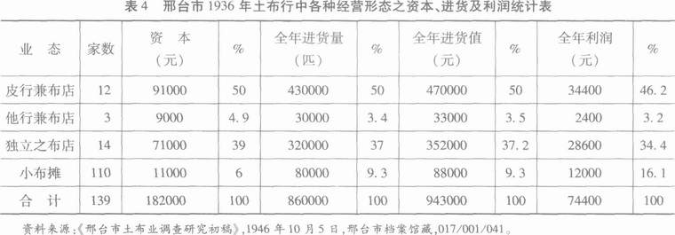 【90】据历史档案资料记载,皮毛店兼营土布约有以下几种方式:“有的是分出资本联号经营。有的是由皮行股东筹资另设布店。有的是由皮行经理和皮毛贩子合伙经营。”参见(商业调查概况)(1945年12月7日),邢台市档案馆藏,017/00I/008。