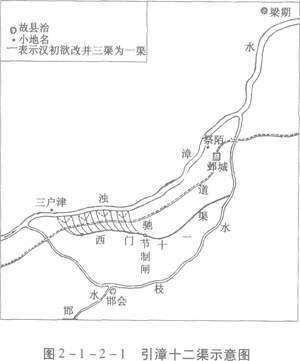 漳水渠,又称漳水十二渠、西门渠,建在战国初魏国的邺地。邺县辖境相当于今河北临漳县、磁县南部及河南省安阳县北部。该地处于漳水由山区进入平原的地带,山区水流湍急,进入平原,流速减缓,夏秋暴雨季节,漳河排泄不及,常泛滥成灾。当地土豪和巫婆串通,利用洪灾,兴办祭祀河神的“河伯娶妻”活动,借机横征暴敛。为了经营好这个东方战略要地,魏文侯二十五年(公元前421年)任西门豹为邺县令(62)。西门豹以解除漳水危害为己任,他破除迷信,严惩害民的乡官巫婆,解除了治水的阻力,发动民众兴修漳河水利,“凿十二渠,引河水灌民田,田皆溉”(63),创建了著名的漳水十二渠。此渠是我国古代明确见于记载的最早的大型渠系引水灌溉工程。