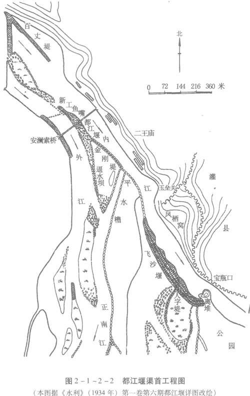 1.渠首枢纽工程。渠首工程虽经历代的多次改进,逐步完善,一些设施位置也有变动,但其主要结构及基本格局,经受了长期的考验,无根本改变,始终保持相对的稳定性和历史的延续性。由于早期历史记载的简略,我们难以详细了解初建时的工程状况,但后代的基本工程结构应导源于战国创建时期。