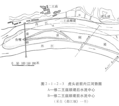 金刚堤:上起鱼嘴,下至飞沙堰。靠内江的一侧叫内金刚堤,靠外江的一侧叫外金刚堤。《水经注·江水三》已有“金堤”之称,说明金刚堤的历史相当悠久。其作用是保护鱼嘴,保证内、外江分流。