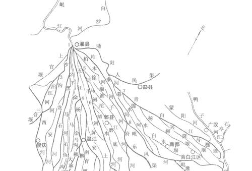 2.渠道系统工程。渠道系统分为内江、外江两个分系统。都江鱼嘴将岷江分为内、外两江。内江古代又称“北江”,过宝瓶口后,在仰天窝建鱼嘴,将内江分为走马河和蒲阳总河,以下太平鱼嘴复将蒲阳总河分为蒲阳河和柏条河,形成内江系统的三大干渠;外江古代又称“南江”,亦建有分水鱼嘴,外江左岸有江安河、杨柳河二条干渠,右岸有沙沟河、黑石河、羊马河三条干渠。以上八条干渠是历史上逐步形成的。早期的干渠,内江开有郫江(今柏条河)、检江(走马河)及蒲阳河,(76)外江开有羊摩江(今羊马河)。干渠以下又通过鱼嘴分成多级子系统的水渠,构成扇形平原河网,组成一个庞大的渠道系统。西晋左思《蜀都赋》描绘成都平原渠系时写道:“沟洫脉散,疆理绮错,黍稷油油,梗稻莫莫。”当时平原河网已经完善。见图2-1-2-4。