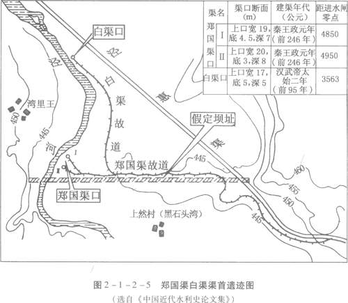 郑国渠渠口的使用时间大约有150年。由于泾河河床的下切,渠道引不上水。西汉太始二年(公元前95年),赵中大夫白公又另建白渠。《汉书·沟洫志》载:“穿渠引泾水,首起谷口,尾人栎阳,注渭中,袤二百里,溉田四千五百余顷,因名曰白渠。民得其饶,歌之曰:‘田于何所?池阳谷口,郑国在前,白渠起后。举苗为云,决渠为雨。泾水一石,其泥数斗。且溉且粪,长我禾黍。衣食京师,亿万之口。”,池阳治今泾阳县西北,谷口应指泾水出山峡处一带,说明白渠渠口更靠近山口。《水经注·渭水》称:“穿渠引泾水,首起谷口,出于郑渠南,名曰白渠。”应理解为白渠引水口在郑国渠北,引水渠道与郑渠交汇后,向南流。康熙《泾阳县志》卷四载:“白公于郑渠上流二千七百余步徙开渠口。”也称白渠15在郑渠口的上游。白渠渠口的具体位置已由泾惠渠管理局勘查确实,在距泾惠渠进水闸基点3400余米处(84),即距郑国渠引水上口约1450米处。见图2-1-2-5。白渠也是无坝引水。有人认为距郑国渠渠15上游250米的井渠遗址,是汉代白渠引水渠(85)。实际这井渠是清代所凿。《续修陕西省通志稿》卷五十七《水利一》记载为清同治三年(1864年)知县徐德良所开。有人做过调查,群众反映祖辈亲眼见到当时施工情况,且遗迹状况较新,“似非远期工程”。(86)白渠是承继郑国渠引泾水的灌渠,以后历代渠口位置虽有变动,但引泾灌溉延续不辍,实源于郑国渠开创之业。