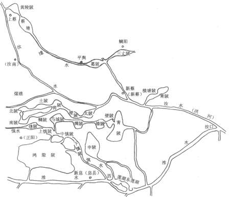以上所载汝南地区的陂塘有30多个,陂塘与陂塘相联,广泛分布于淮水干流与其支流慎水、汝水、滤水、颖水之间,沟渠交络,组成了一个巨大的灌溉网。见下页图2—2—3—5。这种水库群能在大范围内对降雨和径流进行蓄泄调节。