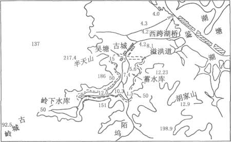 扬州的陈公塘,又名爱敬陂,东汉建安四年广陵太守陈登创建。隆庆《仪真县志》卷七称:“(陈公)塘在县北东三十里,汉广陵太守陈登凿,以资灌溉。周纡九十余里,散为三十六汶。……其塘西北依山,东南面,汉魏间已设堤障,唐宋转运时尝修筑八百九十余丈,置斗门、石垯各一。”又宋代淳熙间楚州参军李孟传《修陈公塘记》[67]称:“倚山为形,独一面为堤,以受启闭。”就是利用山谷三面倚山的有利地形,只在东南一面筑堤,唐宋时堤长890余丈(4.94里),拦蓄36汊山涧水,形成蓄水库,塘周长达90余里。陈公塘能对山洪起储蓄和调节作用,既控制山洪为害,又灌溉塘下l000余顷农田。见下页图2-2-3-2。