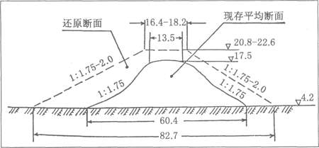 关于堤坝的横断面设计。坝体除自身维持稳定外,还要能经受住水浪的冲击,因此对横断面的形状和边坡要作出合理的设计,古人在实践中很早就对土坝的横断面提出了要求。《管子·度地》提出,堤坝横断面要做成“大其下,小其上”的梯形,这样堤防才能稳定。梯形两腰的坡度应为多大呢?《考工记·匠人》称:“凡为防,广与崇方。其閷参分去一,大防外拥。”东汉郑玄注谓:“崇,高也;方,犹等也;閷者,薄其上。”即是说,所建的堤防,高和底大致相等,然后按三去一的收分,即三比一的边坡向上修筑。如堤高一丈二尺,则堤底宽也为一丈二尺,按三比一的边坡,则顶宽为四尺。但按这样解释,边坡为3:1,明显过陡,既不易修筑,也难于稳定。合理的解释应该是“广”为堤顶宽,高与顶宽相等,两边坡度的总合为“叁分去一”,每边边坡各为1:1.5(即横一点五,纵一)。“大防外稠”,意思是较高的堤防,边坡还要加缓。这一设计理论也为出土的塘堤断面所证实。如春秋时期绍兴建的吴塘,现存吴塘梯形坝体断面的实测数据为:坝顶均宽l3.5米,与地面平均高差13.3米,坝底均宽60.4米,平均坡度l:1.75。这是多年侵蚀后的数据。测量的坝底遗址宽度达82.7米。根据坝底遗址宽度和溢洪道岙底高程,采用1:1.75。2.0边坡推算,原坝顶宽16.4~18.2米,坝高l6.6~18.4米,顶宽与高相等。这样的断面尺寸与《考工记·匠人》的理论设计有着惊人的相似之处[78]。说明《考工记》确实对春秋战国之交修筑堤防的经验作了总结。也可知当时从中原到浙东,堤防的水工水平皆达到了较高的水平。见下页图2-2-3-6、图2-2-3-7。