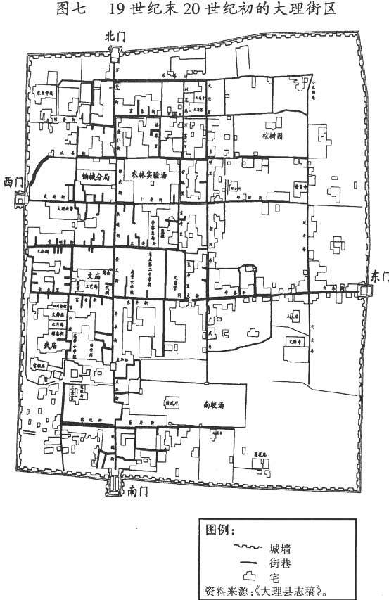 综上所述,洱海区域城市尽管已经有千余年的发展,城市的外缘形态也在数百年前就已经建立,但是,作为城市空间结构的另一个重要组成部分——城市内部地域结构的完善则是在19~20世纪之交时区域内中心城市的街区布局中才较清晰地显现出来。由此我们也看到洱海区域城市之间行政管理的成熟度和城市之间经济发展水平的差异:在经济发展水平不高的情况下,城市街道布局除了以官府衙门为中心外,更多地会表现为一种自然形态,无所谓城市的功能分区。官府虽然对官衙、学府等地址加以关注,但却缺少对整个城市街区的规划。那种“州前街”、“东街”、“西街”等就属此类。在19~20世纪之交,大理府城内行政、商业、手工业等区域的划分,表现出城市内部地域结构逐步完善的一面。这种完善在另一方面又可以表明大理府城和洱海区域其他城市之间的经济发展水平差异。显然,没有相应的经济发展,城市内部地域结构的真正构建是难以完成的(这点将在下文进一步阐述)。