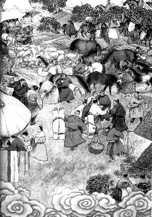 蒙元时期是草原丝绸之路最为鼎盛的阶段。成吉思汗建立横跨欧亚的蒙古汗国,道路四通八达,并建立驿站制度,至元朝建立,以上都、大都为中心,设置了帖里干、木怜、纳怜三条主要驿路,构筑了连通漠北至西伯利亚、西经中亚达欧洲、东抵东北、南通中原的发达交通网络。元代全国有驿站1519处,有站车4000余辆,这些站车专门运输金、银、宝、货、钞帛、贡品等贵重物资。当时,阿拉伯、波斯、中亚的商人通过草原丝绸之路往来中国,商队络绎不绝。此时最为著名的商贸城市是元上都。元上都城内的西关,是各国商人进行交易的地方,史载:“(上都)自谷粟布帛,以至纤靡奇异之物,皆自远至。宫府需用百端,而吏得以取具无阙者,则商贾之资也。”(虞集:《贺丞相墓铭》,载《道园学古录》卷十六),可见商品交易之盛况。在元上都,外国使者、旅行家、商人、教士等频繁来访,如发郎国的使者最早在中统年间就在开平觐见过忽必烈。至元年间,元惠宗派遣发郎国人安德烈及其他15人出使欧洲,致书罗马教皇,教皇又派遣马黎诺里等人到元上都回访元惠宗,并呈献罗马教皇的回信和礼物。最为著名的事件是意大利商人马可·波罗在至元十二年(1275年)随父来到元上都,受到忽必烈的接见,回国后写下了著名的《马可·波罗行纪》,向西方详细介绍了元上都的宫廷生活和礼仪、蒙古族的生活风习等。另外,印度、缅国、尼波罗国的使者、僧侣、工艺家、商人等都曾来到过元上都,当时的元上都是国际性的大都会。有诗曾形象地写道:“酒馆书填金,市中商贾集,万货列名琛”。