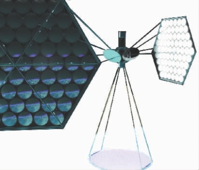 集成对称聚光系统:NASA在20世纪90年代末的SERT研究计划中提出的方案。采用了位于桅杆两边的大型蚌壳状聚光器将太阳能反射到两个位于中央的光伏阵列。聚光器面向太阳,桅杆、电池阵、发射阵作为一体,旋转对地。聚光器与桅杆间相互旋转以应对每天的轨道变化和季节变化。