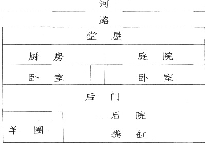 堂屋后面是厨房,大小仅为堂屋的四分之一。灶头和烟囱占厨房面积的三分之一。紧靠烟囱有供灶王爷的神龛和小平台。 再往后是卧室,家中如有两个家庭单位时,就把卧室用木板隔成两间。每间房里放一、两张床。已婚夫妇和七八岁以下的孩子合睡一张床。孩子长大以后,他或她先在父母屋里单独睡一张床,再大一些的未婚男孩就搬到堂屋里睡,像那些雇工一样。女孩出嫁前一直睡在父母屋里,也可以搬到祖母屋里去,但决不睡在堂屋里,因为妇女是不允许睡在供祖先牌位的房屋里的。