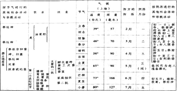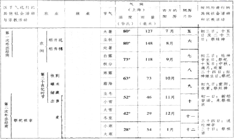 “村里的人,每年有两个清闲的时期,第一个阶段是在秋天,从处暑到寒露,为时约两个月……第二阶段是在冬天,从大雪到年底,也是两个月,在这农闲季节,我们出去经商。” 农民用传统的节气来记忆,预计和安排他们的农活。但节气不能单独使用,因为没有推算日期的办法,在使用上有困难。农村用阴历来算日子。人们必须学习每年各个节气的相应日期。例如上表所示,第一个立春是在正月十三日,而第二个立春则在十二月二十三日。因此,也可以这样说,阴历通过节气系统来安排人们的工作顺序。