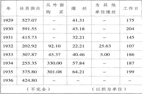 上表说明从1930年到1935年社员供应蚕茧的数量逐渐下降(B栏,Ⅲ项,3.b)。1932年总供应量还不足以供工厂开工一百余天之用。机器闲着不转是不经济的。因此,还需从市场购买一些蚕茧。1934年从市场购买的蚕茧量比社员供应的多。在另一方面,工厂还接受其他工厂供给的原料代为缫丝的订货。这种方法被称为“代缫”,即为其他人缫丝。1932年为别厂缫丝超过25担,实际上相当于从村里供应原料的缫丝量。1935年工厂重新装备以后,丝的总产量超过前几年平均量的三分之一。但社员的蚕茧供应没有跟上来,虽然1935年稍有增加。在原料供应方面,工厂是半依赖于外界的。