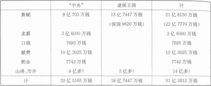 再加上役、兵役,奴婢、罪犯的劳动力收入。但由于王国不能随意征发兵役,因此不能单纯计算。并且也应该考虑皇后、太子的收入。如果有田租刍稿税收入,那么“中央”可收取田租15亿多、刍稿2亿多,王国可收取的田租略少于30亿、3亿多刍稿的收入。并且再加上公田收入。