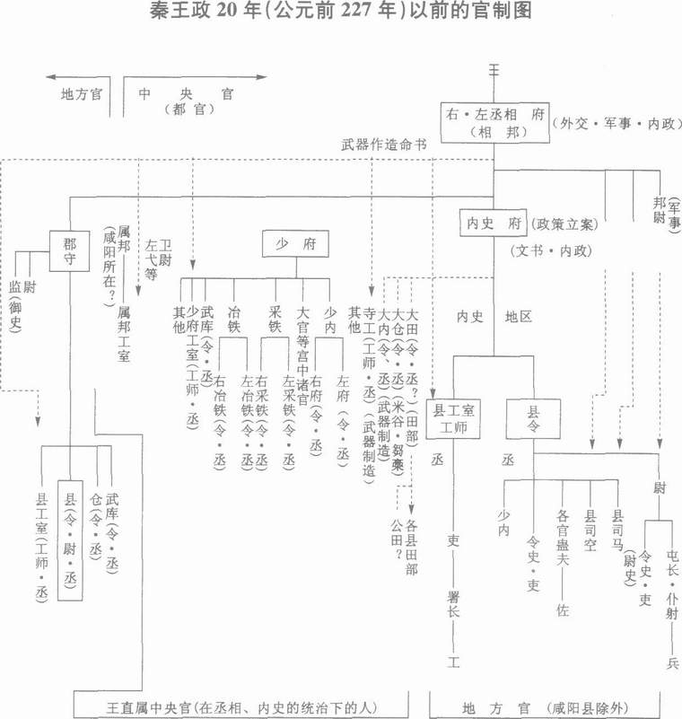 上例中可以看出商鞅以后进行迅速的官制、爵制整顿与财政制度的形成相关。以此为前提将睡虎地秦简等为史料,根据《山田13》、《山田15》中的研究,如下制作了秦王政20年(公元前227年)以前的官制图。