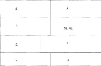 居住方式,总起来说,现在仍然同费过去描述的一样,但并非所有的住家都严格照这种方式居住。试举两个例子来说明住房的不同安排。第一个住家共有5人(应为6人——译注),包括户主、户主的母亲、舅父、小女儿、弟媳、小侄子。户主的妻子1949年以来一直在苏州的一个工厂工作,每个阴历新年回家探亲十天。户主的弟弟参军已一年。该住家在5间房,安排情况如下图: